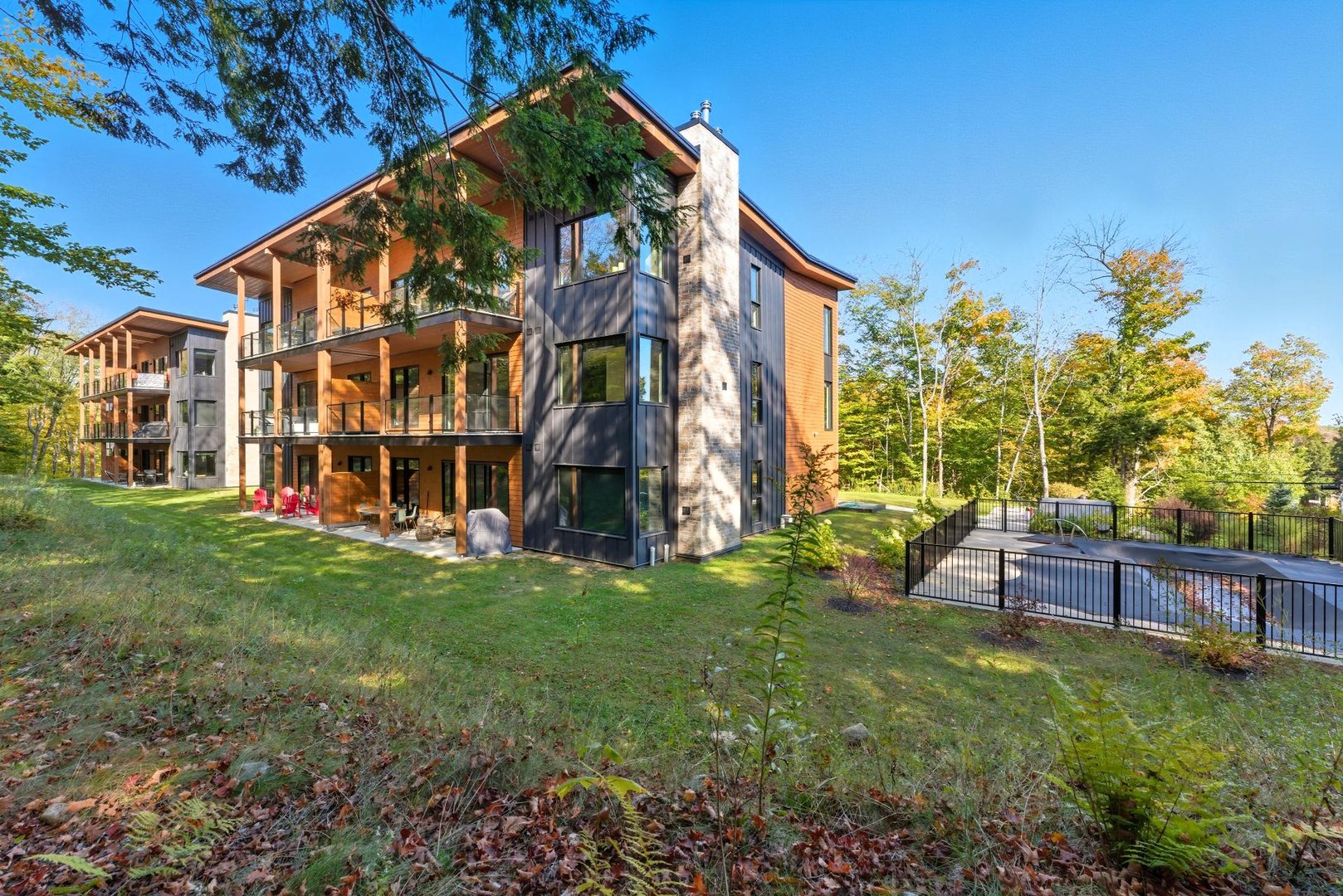 Located at the foot of Mont-Orford, this high-end unit combines luxury, comfort, and modern elegance. Bright open-concept living area with abundant windows, custom kitchen with central island, wood stove, and refined finishes. Radiant floors throughout the living spaces for unmatched comfort. Two bedrooms, including a primary suite with ensuite bathroom, plus a second full bathroom. Direct access to the lawn, heated pool, spas, trails, common room, and elevator. Two indoor parking spaces, private storage. Sold furnished. Short-term rentals permitted.