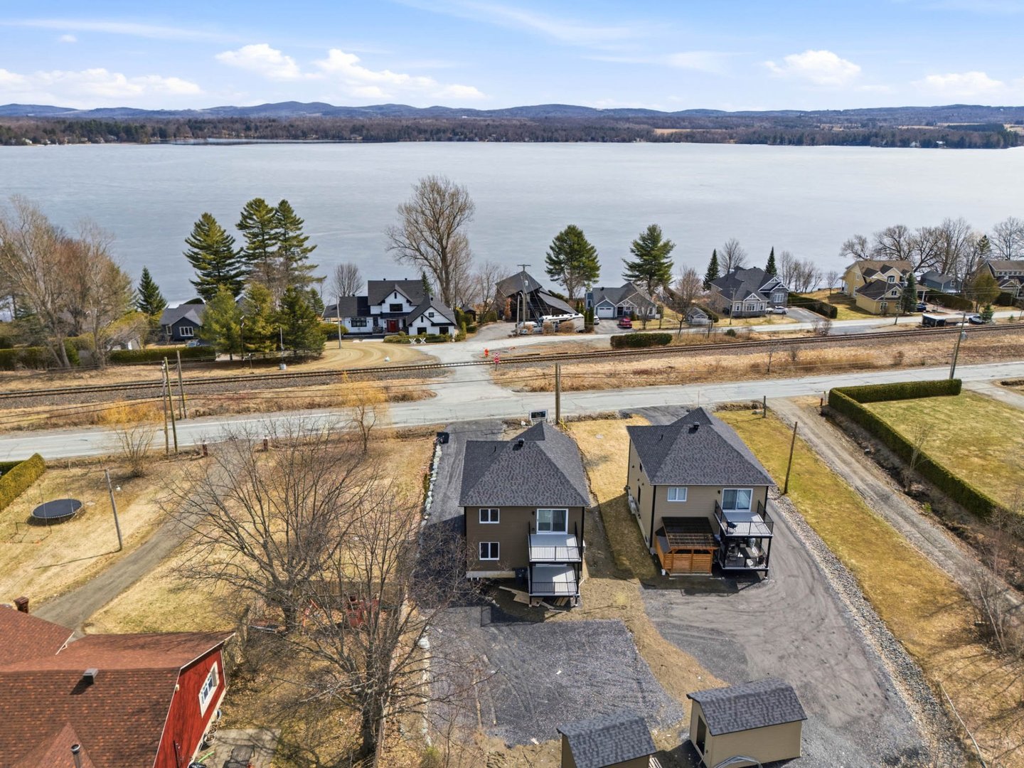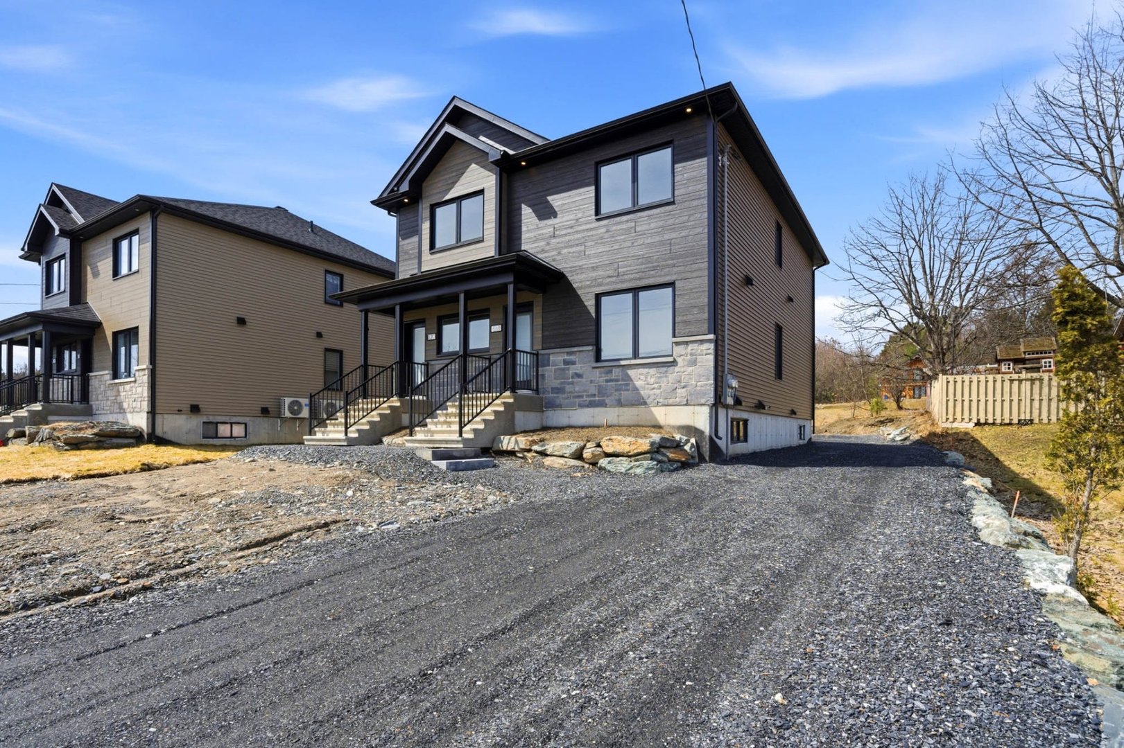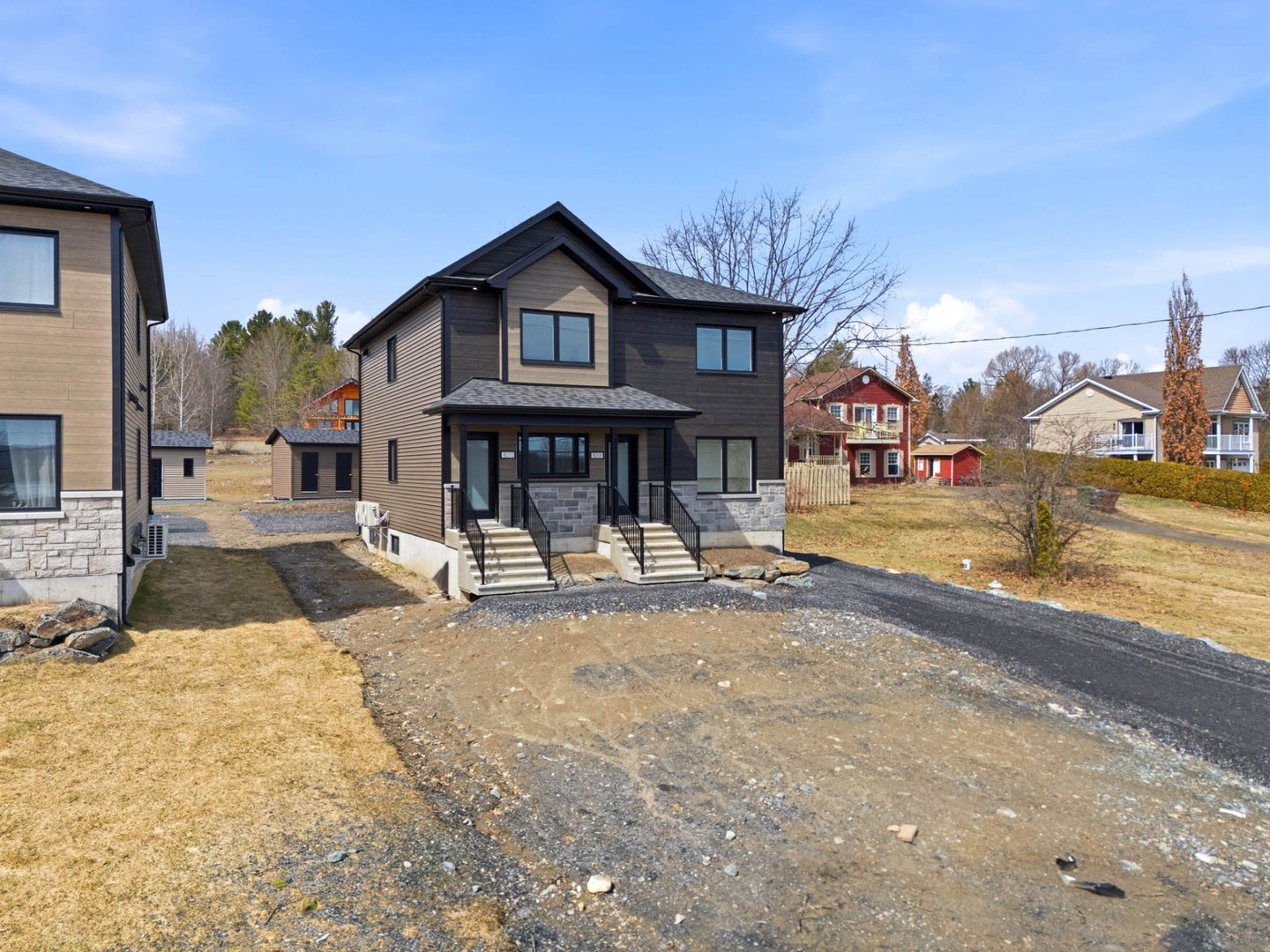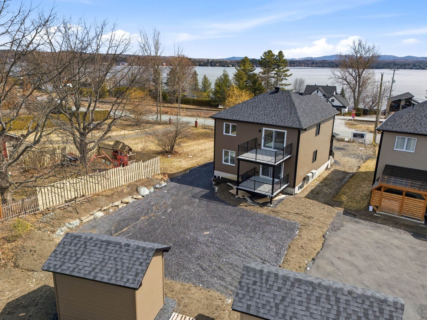 Duplex neuf 2025 à deux pas du lac Magog! Unité 8268 : splendide 6½ de 2 300 pi² sur 2 niveaux, 4 ch., 2 s.d.b., cuisine avec îlot, comptoirs de quartz, armoires mélamine noyer, garde-manger et walk-in d'entrée. Unité 8270 : lumineux 4½ de 1 150 pi², 2 ch., mêmes finitions haut de gamme. Une thermopompe par unité, balcons arrière 12'x 12' en aluminium durable, portes-patio et planchers de vinyle. Deux remises indépendantes. Terrain de 12 000 pi². Terrassement à compléter aux frais de l'entrepreneur. Vue sur le lac. Idéal pour investisseur ou propriétaire-occupant. Libre immédiatement!