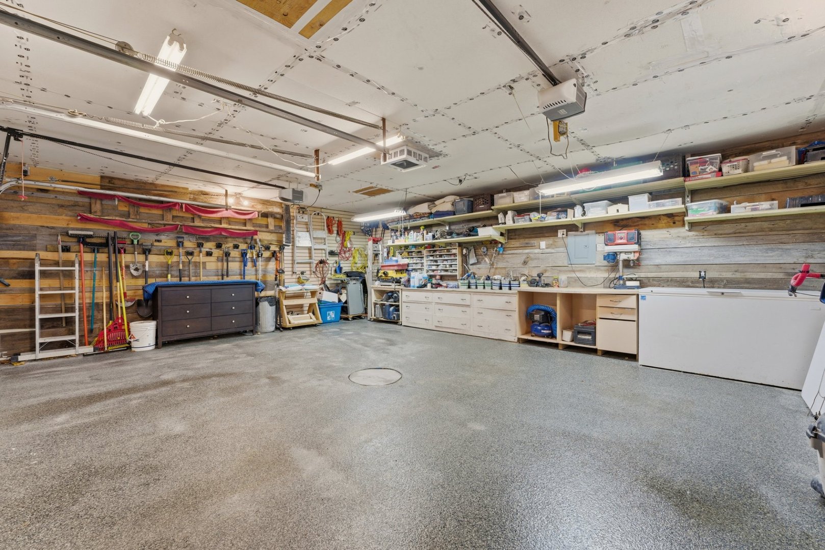 Lustres, luminaires, stores, rideaux et tringles, aspirateur central et ses accessoires, balançoire extérieure, remise.